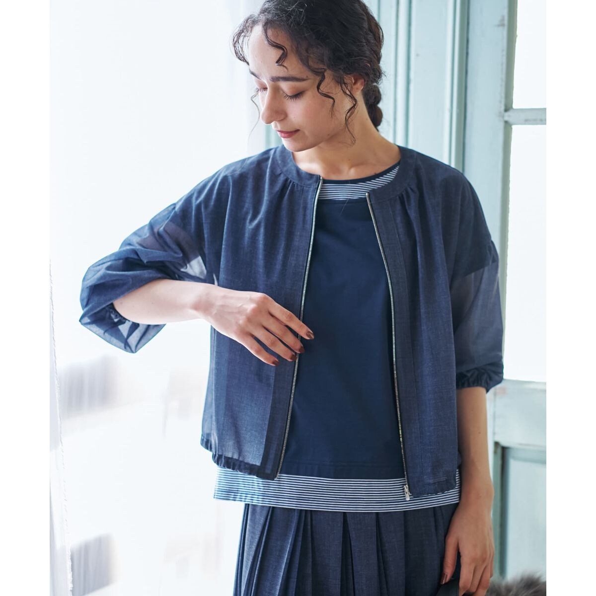 さらりと羽織れる薄手素材のノーカラージャケット。伸縮性のある生地に加え、裾と袖口はゴム仕様で、動きやすく快適な着心地を実現しています。透け感のある素材が軽やかな印象を演出。フロントジップでスムーズに着脱でき、カジュアルな着こなしはもちろん、きれいめスタイルの外しアイテムとしても活躍します。カーディガン感覚で気軽に羽織れる、デイリーユースにぴったりの一枚です。