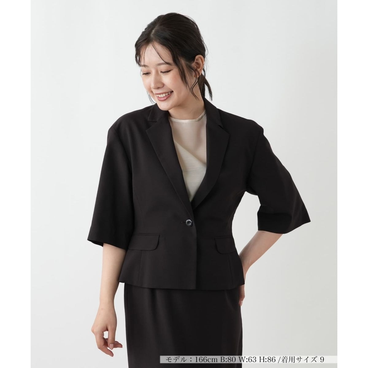 こなれた雰囲気のコーディネートが叶う五分袖ジャケット。ウエストを程よくシェイプしたコンパクトなシルエットが、女性らしいラインを演出し、スタイルアップを後押しします。すっきりとした1つボタンのデザインで、洗練された印象に仕上げました。ジャケットのきちんと感はそのままに、手首が覗く袖丈でカーディガンのような軽やかさと抜け感をプラス。オフィスルックにはもちろん、週末の外出からオケージョンまで幅広いシーンに対応しそうです。