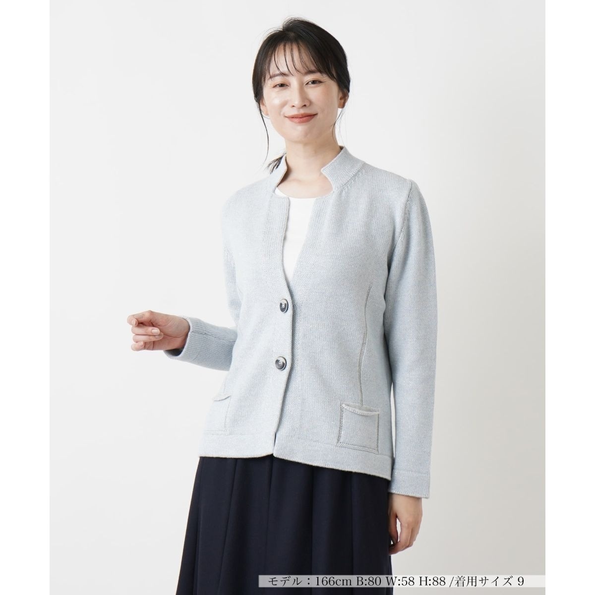 上級者らしいひと味違った印象の着こなしが楽しめる、やや薄手のニットジャケット。ざっくりと編まれたニットにラメ糸が煌めき、リュクス感溢れる表情を生み出しています。前立てにあしらった丸ボタンやさりげなく効かせたラインのアクセントが絶妙。すっきりとした定番のパンツルックはもちろん、フェミニンなスカートを合わせた大人エレガントなコーディネートとも好相性のトップスです。