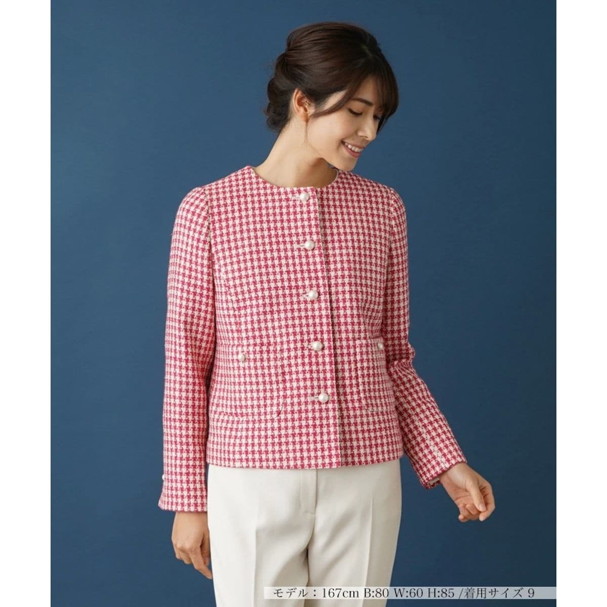 クラシカルな千鳥格子柄をビビッドカラーで表現した、ツィーディーな風合いのノーカラージャケット。前立てやポケット、袖口にトッピングした大粒のパール調ボタンがさりげなく気品を感じさせるアクセントに。やや短めの丈感となっており、様々なボトムスとバランスよくコーディネートできます。一点投入でスタイリングを新鮮な印象にアップデートしてくれるアウターです。
