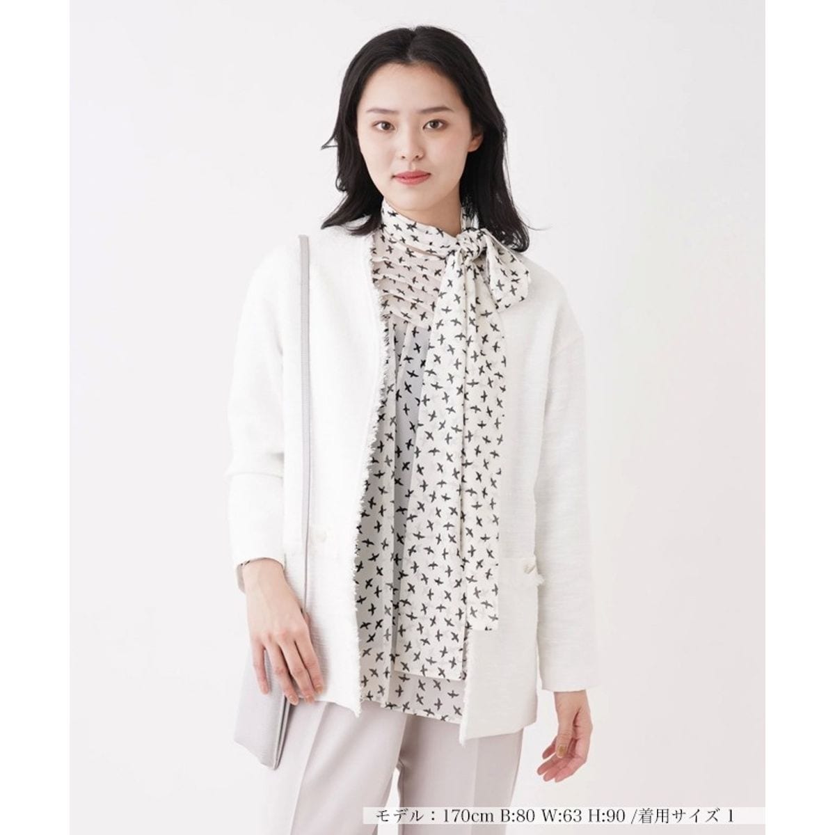 ネックラインから前立てを飾るフリンジが軽やかな表情をみせてくれるツイードジャケット。すっきりと開いたVネックが絶妙なバランスの抜け感を演出し、フロントは留め具なしのノーボタン仕様となっています。ポケットの飾りボタンが上品さのあるアクセントに。ヒップまで隠れる着丈とゆとりを持たせたシルエットで気軽に着こなしやすく、季節の変わり目の時期のライトアウターとしても活躍します。パンツにもスカートにも合わせやすく、着回し力の高いアイテムです。