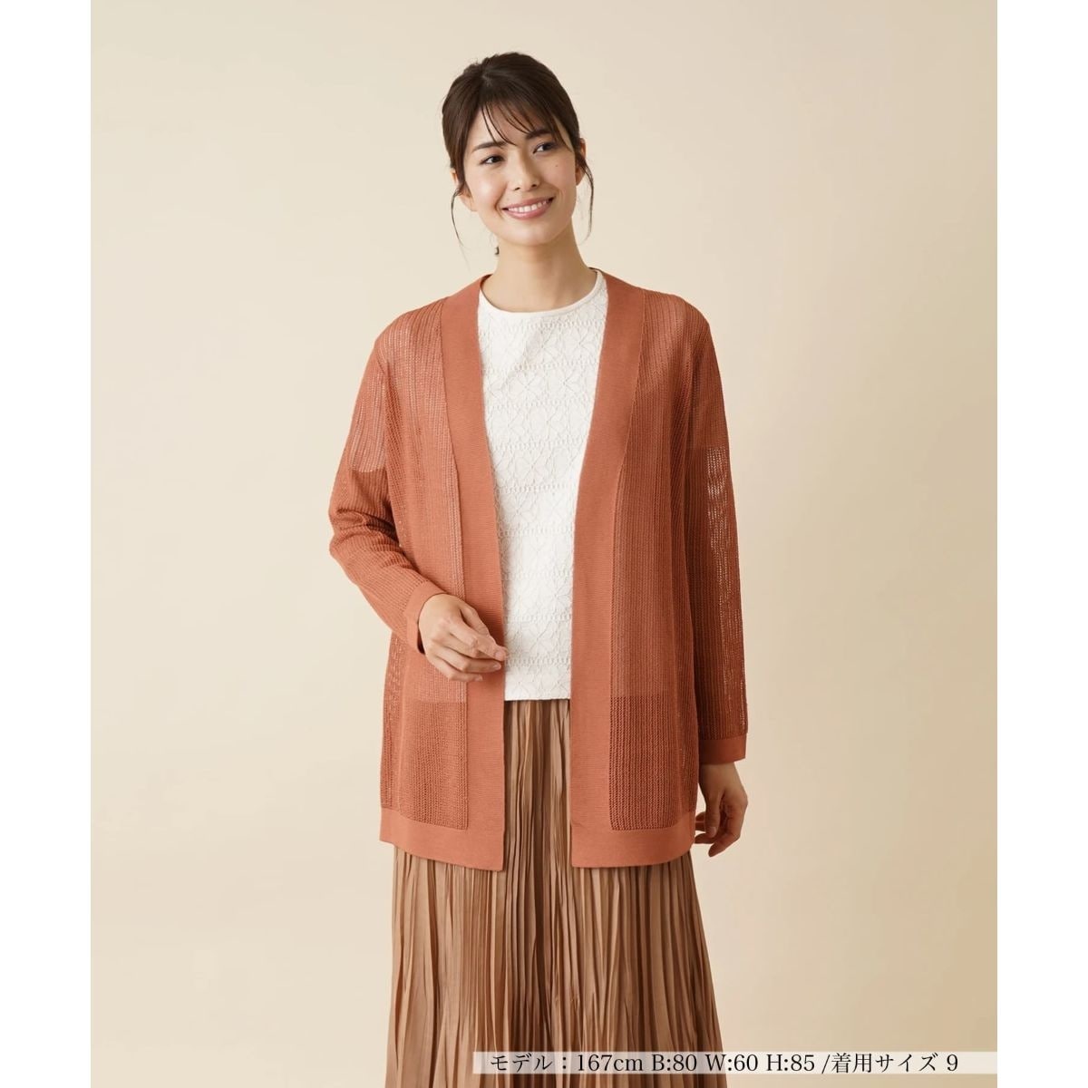 大人の女性らしいエレガントな表情を見せてくれる、透かし編みのニットカーディガン。ボタンのないシンプルなデザインで綺麗めのコーディネートにも取り入れやすい一枚。ヒップまで隠れる程度の丈感で自然な印象で体型カバーできます。フェミニンなスカートとの合わせはもちろん、ノースリーブワンピースとの羽織りにもオススメのアイテムです。
