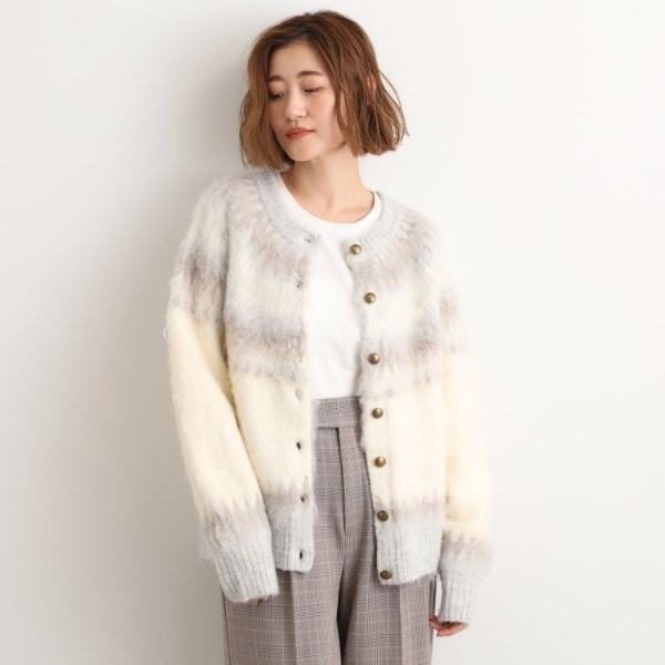 求心ジャカード編みが目を惹く、キャッチーなニットカーディガン。