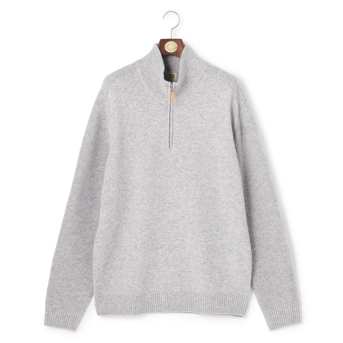 ■仕様前身頃はすっきりとした天竺編みを採用し、クリーンな印象に。袖と後身頃にはワッフル調の凹凸ある編地を配し、素材の立体感と色の濃淡が際立つように設計。肩のラインにはサドルショルダーを取り入れ、J.PRESSらしいトラッドな要素と、腕の動きやすさも両立。フロントはハーフジップ仕様で着脱がしやすく、インナーとのレイヤードも自由自在。衿の開き具合で表情を変えて楽しめるのも魅力のひとつです。