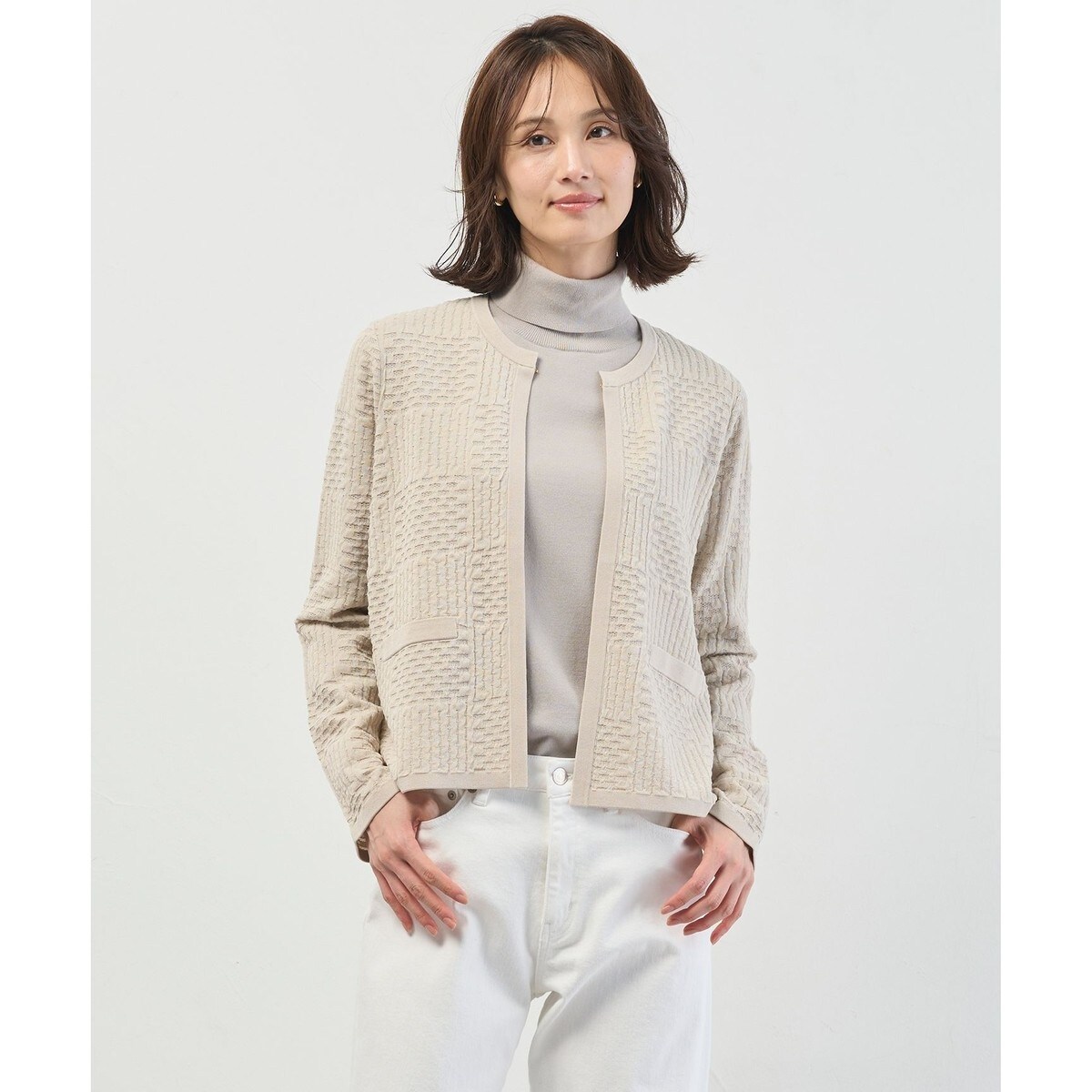 ■デザインジャガード編みで仕立てたニットジャケット。繊細な凹凸感で描いた表情のある素材感が、無地でありながらも奥行きと高級感を演出します。ノーカラーのすっきりとした襟ぐりと、程よくゆとりを持たせたコンパクトなシルエットで、シンプルなインナーを合わせるだけで洗練された着こなしに。軽やかな着心地で長時間着ていても疲れにくく、きちんと感と快適さを兼ね備えた、幅広く活躍する1着です。