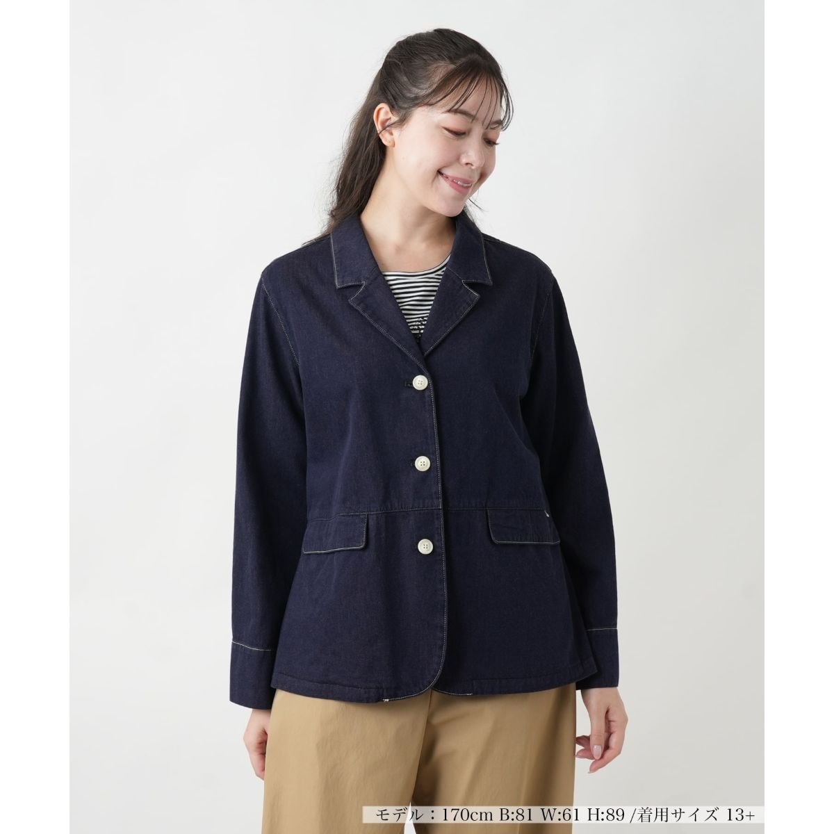 程よくゆとりを持たせたデニムジャケット。ウエスト部分を切り替えて、バックにギャザーをいれることで女性らしいシルエットに仕立てています。釦とステッチを白で効かせて春らしく爽やかな印象に。きれい見えするデニムジャケットです。