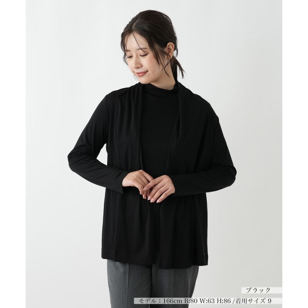 フロントボタンを取り付けない、流れるようなドレープが美しいノーボタンカーディガン。さっと気軽に羽織るだけで、縦のラインを強調したすっきりとした着こなしが完成します。気になるヒップ周りを自然にカバーしてくれる着丈も嬉しいポイント。やや薄手の滑らかなコットンを使用しており、動きやすくストレスフリーな着心地です。裾にあしらったさりげないロゴプレートが上品なアクセントに。オンオフ問わず多彩なスタイルに合わせやすい、着回し力抜群の一枚です。