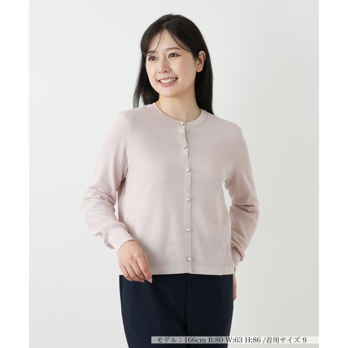 パール調ボタンが上品さを演出するクルーネックカーディガン。レーヨンナイロンのしなやかで滑らかな生地は肌触りが良く、伸縮性にも優れているため着心地も快適。コンパクトな丈でワンピースやスカートとも相性抜群です。羽織るだけでスタイルアップ効果も期待でき、ボタンを全て留めてプルオーバー風に着こなすのもおすすめ。オンオフ問わず活躍する、頼れるアイテムです。
