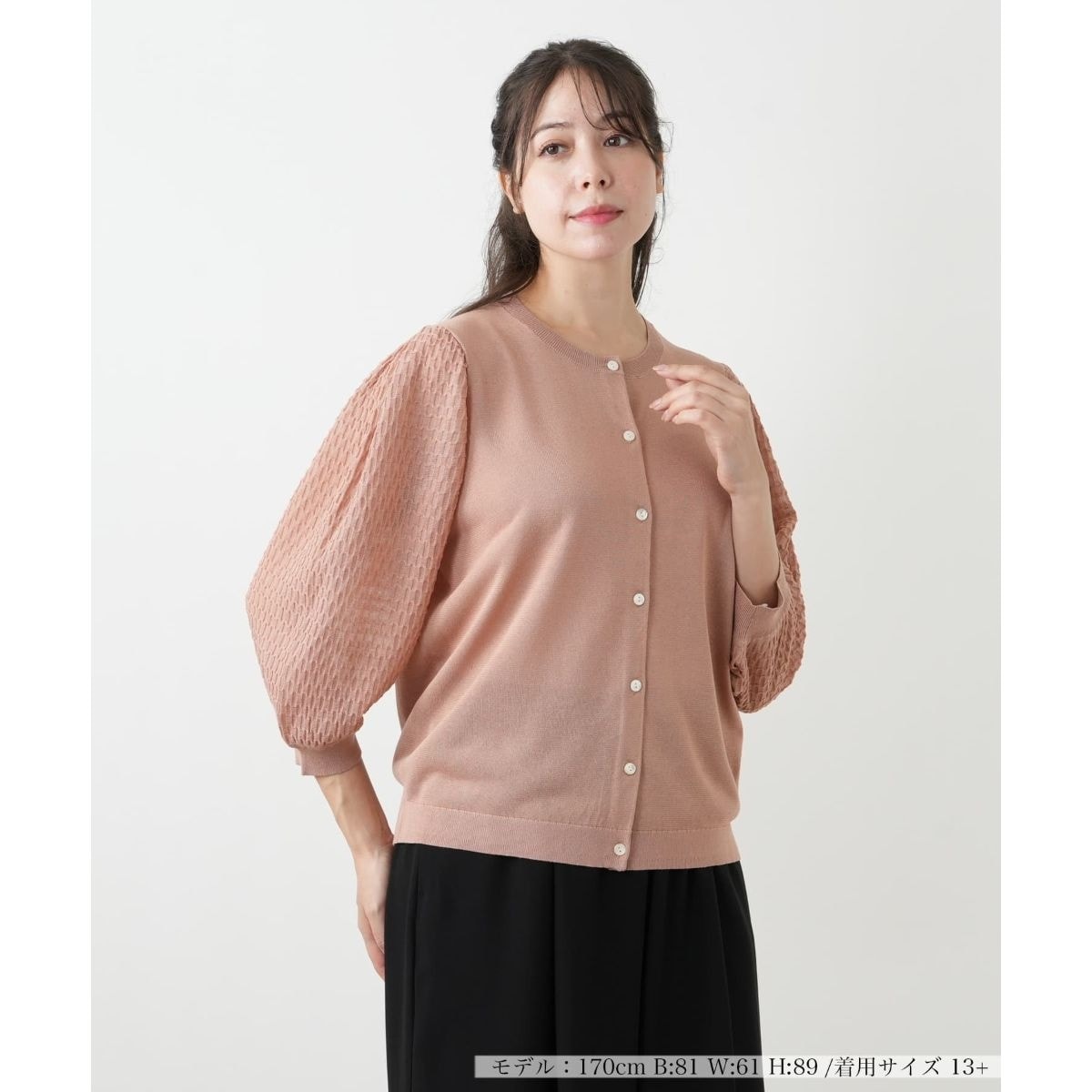 ふんわりとしたバルーンスリーブと、表情豊かな編み地がフェミニンムードを演出するカーディガン。身頃は滑らかな質感のレーヨンポリエステル素材を使用し、上品な佇まいに仕上げました。袖の立体的な編み地とのコントラストがデザイン性を高めるポイント。軽やかな羽織りとしてはもちろん、フロントボタンを留めてプルオーバーのような着こなしも楽しめる、一枚で着映えするトップスです。