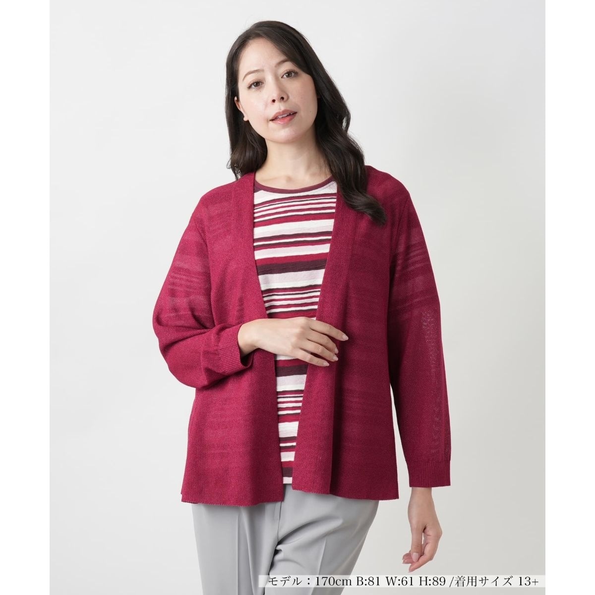 さらりと羽織るだけで上級者らしいコーディネートが完成するトッパーカーディガン。ほんのりと透ける繊細な編地が春夏らしい軽やかさを演出。通気性に優れたニットは肌にまとわりつかず、暑い季節にも快適な着心地を叶えてくれます。フロントはボタンレスで仕立て、縦のラインをすっきり強調するデザインに。Tシャツやブラウスにさらっと重ねるだけで、気負わないレイヤードスタイルが簡単に完成します。