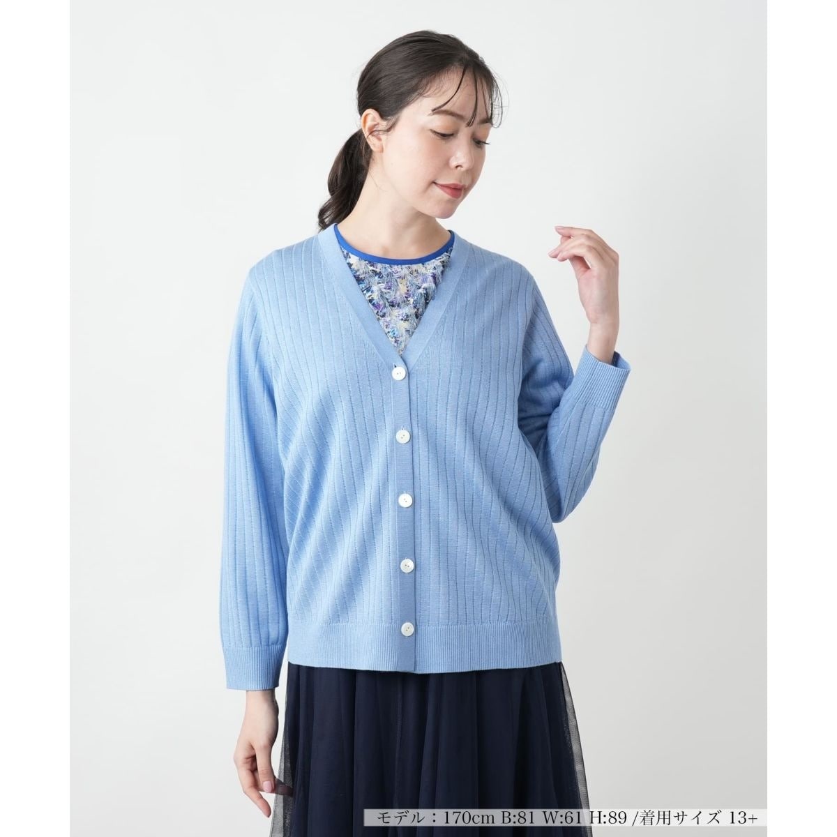 光沢感のある編地がエレガントなVネックカーディガン。リブのように見えますが、特殊な編み方で縮みにくくしており、身体にピッタリと張り付きにくくラインを気にせずにお召し頂けます。表には光沢のあるレーヨンポリエステル、肌に触れる裏面はコットン100%を使用し素材を使い分けて編み上げています。