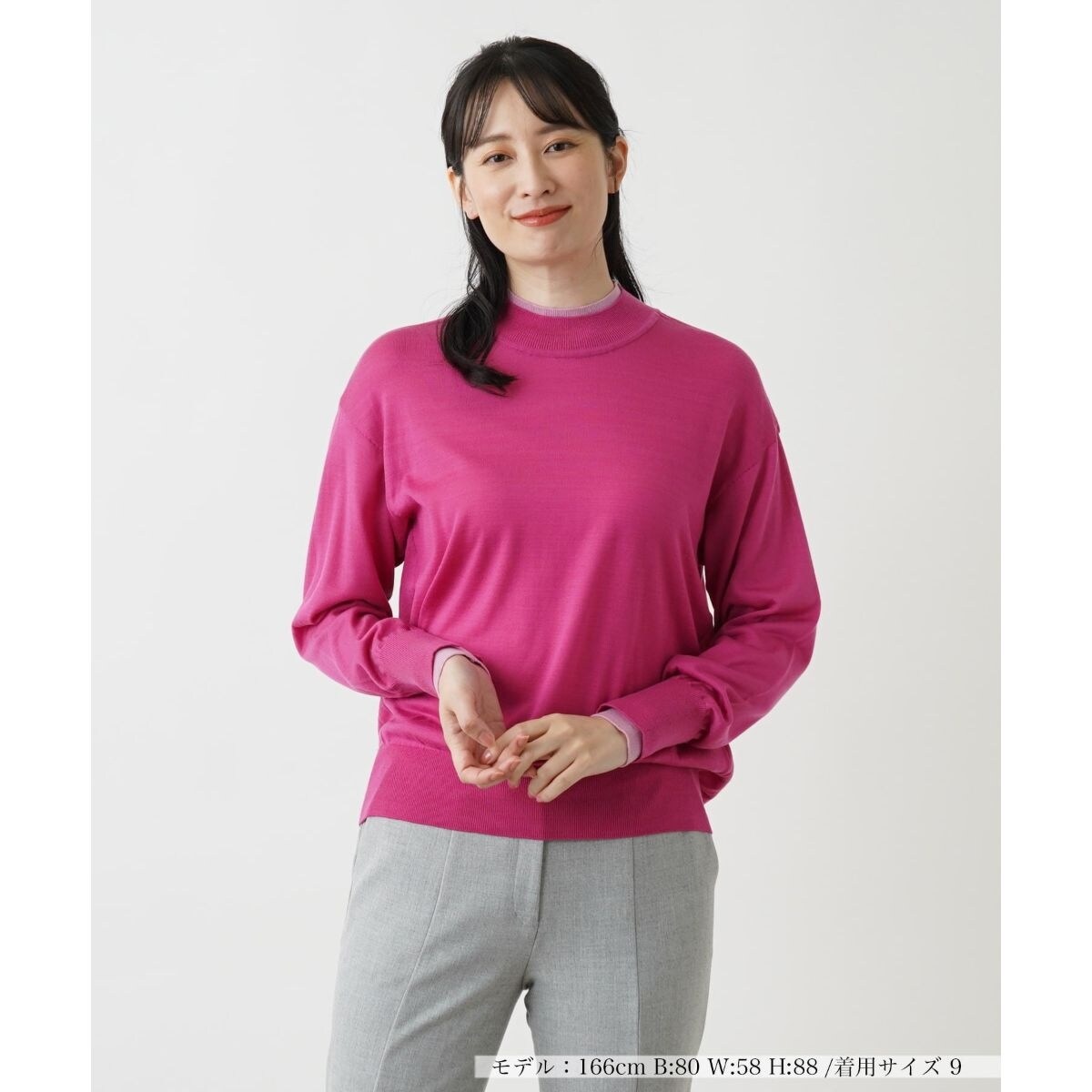 袖口と衿元の配色がアクセントのハイゲージニット。配色使いでレイヤード風に見せたデザインがポイントです。ゆったりしたサイズ感で後ろ裾はラウンドしたシルエットに。シンプルながらも着るだけでさりげないお洒落を演出する目を惹く一枚です。