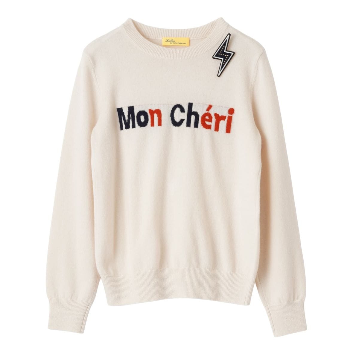 ロゴをインターシャで編みで仕上げたニット。