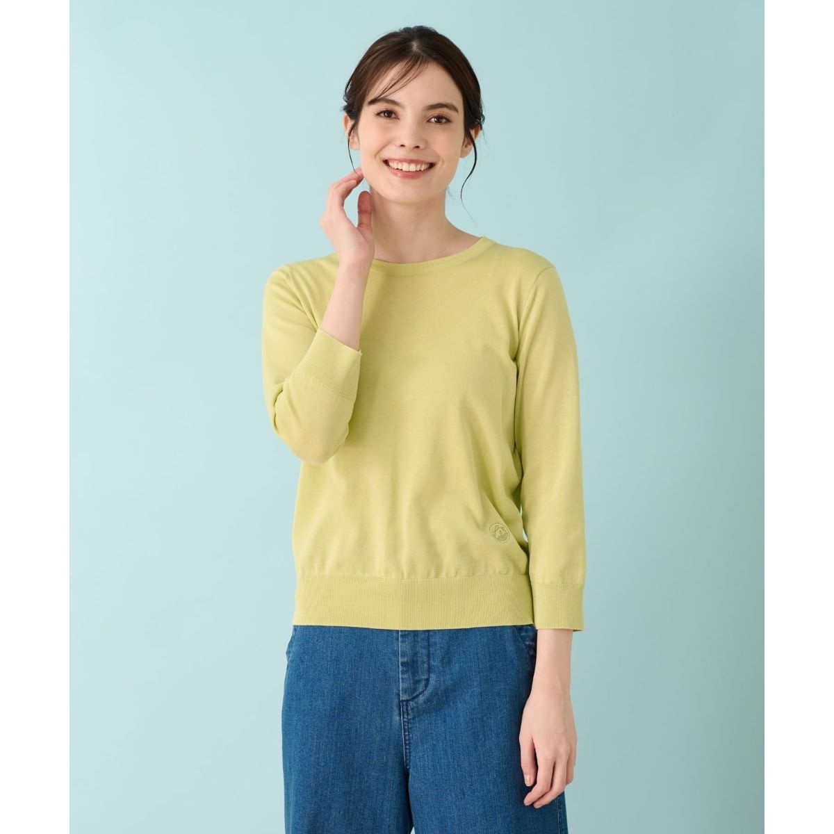 シンプルな七分袖ニットインナー。オリジナルモチーフを左裾に刺繍して、アクセントにしています。さらっとした風合いが特長のコットン糸を使用しています。春から初夏にかけて便利に着回しできます。