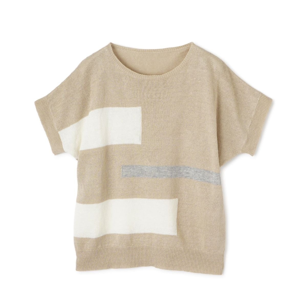 ダイナミックで抽象的な配色デザインの半袖ニットプルオーバー。さらりとした軽く爽やかな手触りの麻素材で仕立てているから、暑くなるこれからの季節も着心地快適。柔らかな中間カラーが気取らない優しげな着こなしを演出します。