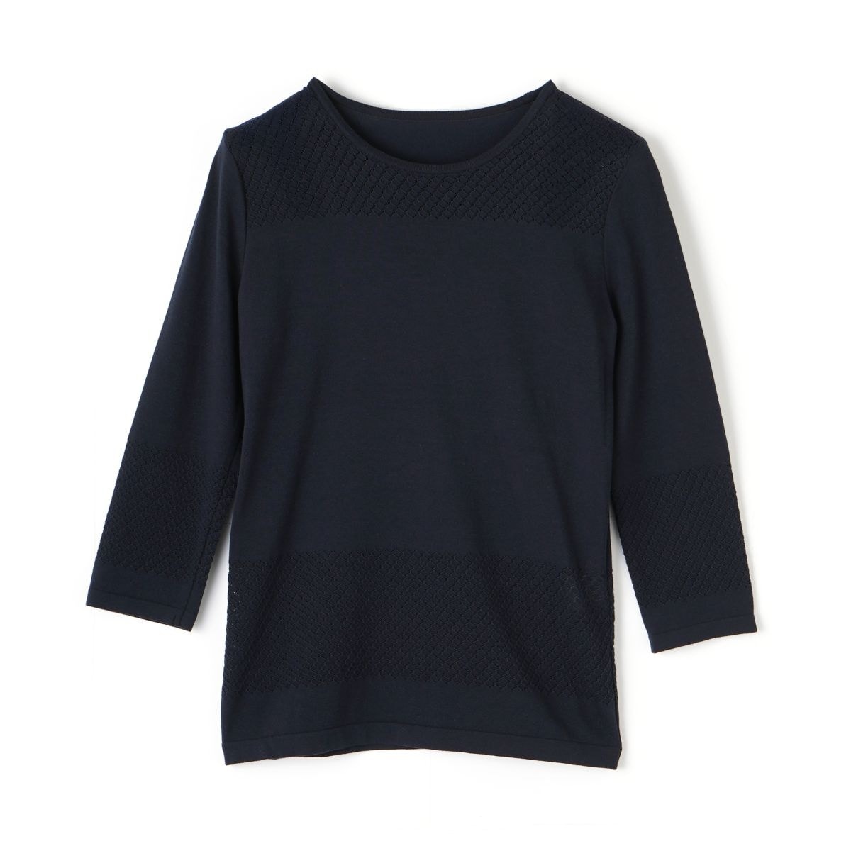 ショルダーや裾に取り入れた透かし柄編みが、軽やかさを高めるニットプルオーバー。程よく手首が覗くクロップドスリーブが、シーズンらしい涼感を生み出します。しなやかな肌触りでロングシーズン活躍する1品。