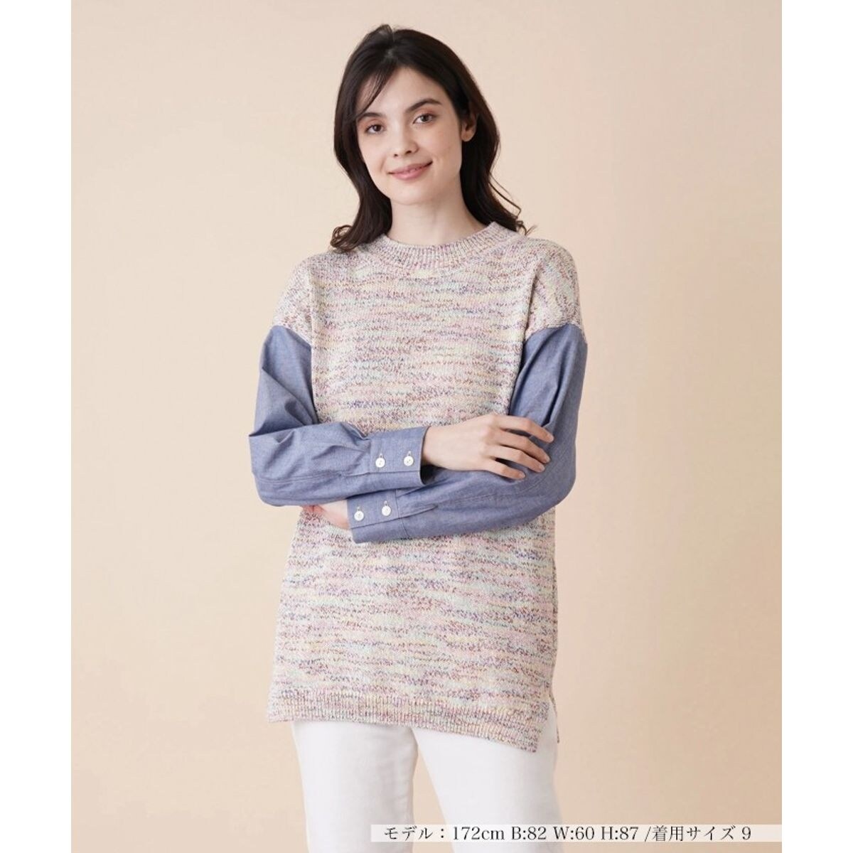 ミックスカラーヤーンを丁寧に編み上げた、カラフルなテクスチャーのニットプルオーバー。スリーブ部分をデニム地のシャツ素材で切り替えており、インにシャツを差し込んだようなレイヤード風デザインが技アリ。ひと味違ったコーディネートが手軽に完成します。シンプルなパンツはもちろん、カジュアルなスカートにも合わせやすく、着回し力の高いトップスです。