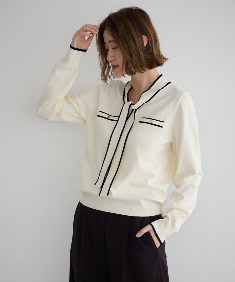 配色ラインをアクセントに、胸のフェイクポケットやボウタイデザインがきれいめスタイルに取り入れやすい1枚です。