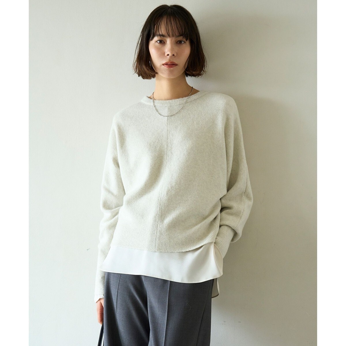 ■デザイン前後着用可能で着まわしやすい、2WAY仕様のカーディガン。リラックス感のあるドルマンスリーブが、二の腕をカバーしつつ、体のラインを拾いすぎないデザインです。小さめなパールボタンが、コーディネートのアクセントになります。後ろあきで着用しても、小さめのボタンなのでぼこぼこせずストレスフリーな着心地です。