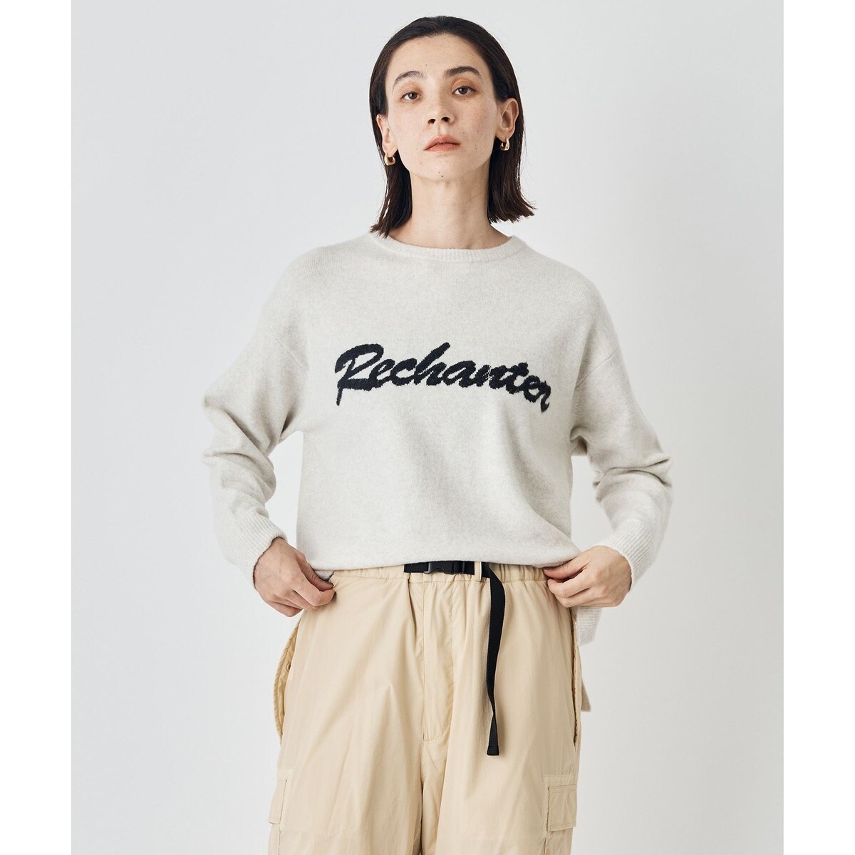 ■デザインワイドシルエットでどんなボトムにも合わせやすい、クロップドレングスのプルオーバー。フロントには、手書き風フォントのロゴ入りで、シンプルながらアクセントになります。ロゴの意味:「Rechanter」再び歌う(フランス語)