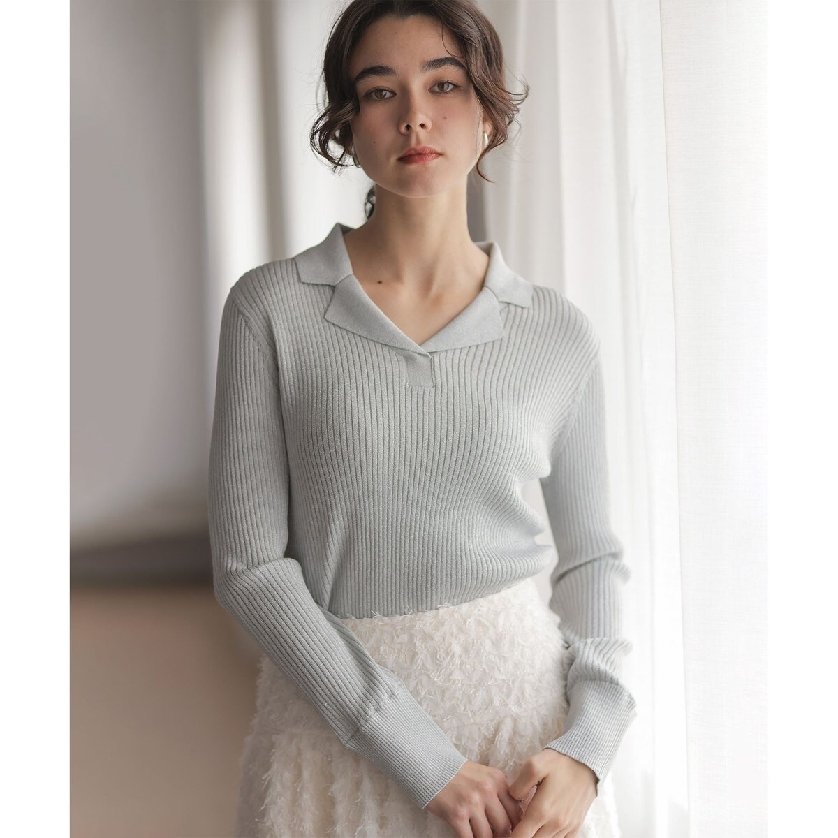■デザイン・やや抜け感のあるテーラードのようなポロ襟がデコルテラインをきれいに見せてくれるレディーライクな印象のリブニット。・身体のラインを拾い過ぎない程よい細身のシルエットはボトムのシルエットを選ばず活躍間違いなしのアイテムです。