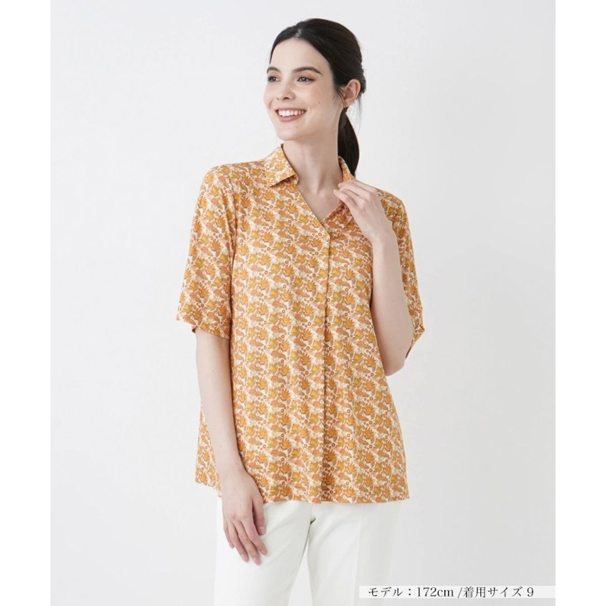 エキゾチックなボタニカル柄のプリントが個性を引き立てるスキッパーブラウス。シャープに開いたネックラインがデコルテを覗かせ、絶妙なバランスの抜け感を作り出します。とろみのあるやや薄手のストレッチ素材が体に優しく寄り添ってくれるから着心地も良好。ヒップまでさりげなく隠れる程度の丈感でナチュラルに体型カバーできるのも嬉しいポイントです。定番のパンツはもちろん、フェミニンなスカートを合わせた華やかな着こなしもサマになります。