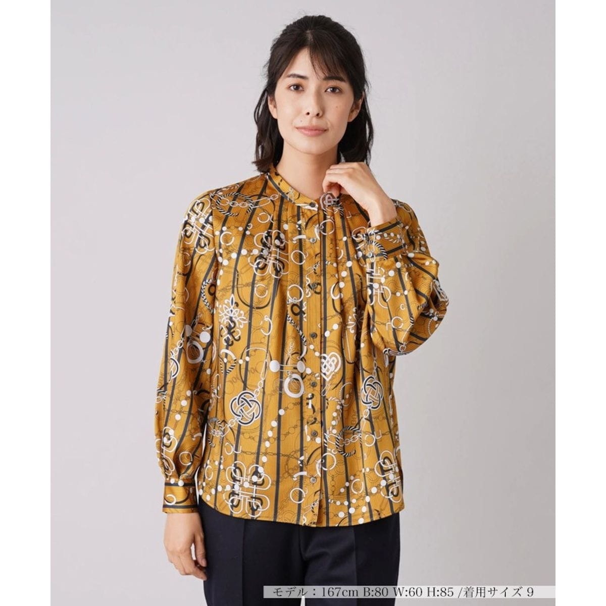 ストライプ×チェーンのドラマティックな総柄プリントを施した、光沢感のあるサテン生地で仕立てたブラウス。バンドカラーですっきりとデザインしつつ、袖にボリューム感をもたせてリラクシーな雰囲気に。インパクト溢れるグラフィックがスタイリングを個性的に盛り上げてくれるから、シンプルなボトムスとのワンツーコーデもサマになります。
