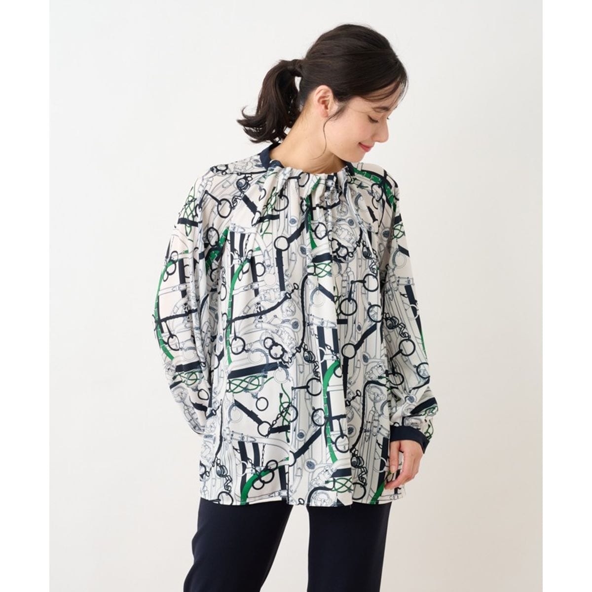 アンティーク調のベルトチェーン柄をプリントしたオーバーブラウス。イタリア製の落ち感のあるポリエステルデシン素材を使用しています。襟ぐりと袖口には贅沢なギャザーワークを施し、サイドからバックネックは配色でメリハリ感をプラス。袖はラグランスリーブで仕上げており、ゆったりとした柔らかなシルエットでデザインしました。ボトムスに合わせてイン・アウトしてコーディネートをお楽しみいただけます。バックファスナーあり。