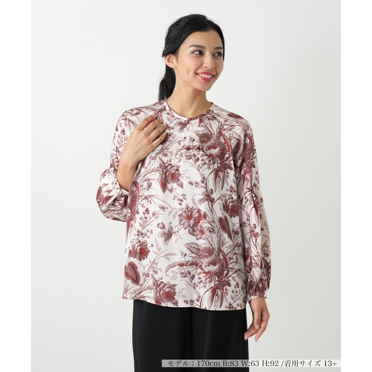 イタリア製生地「ERICA(エリカ)」を使用した、美しいボタニカルプリントの長袖ブラウス。ウインターガーデンをイメージした繊細な線描きがインポートらしい上品さを醸し出し、見る人を魅了します。上品な光沢のあるポリエステルサテン素材が、優雅なドレープを生み出し、一枚で華やぎます。ノーカラーの丸首デザインは、デコルテラインを美しく見せ、合わせるアクセサリーも引き立てます。ご自宅で手洗いできるウォッシャブル仕様で、日常のお手入れも簡単。特別な日のおしゃれはもちろん、普段の装いも格上げしてくれるブラウスです。