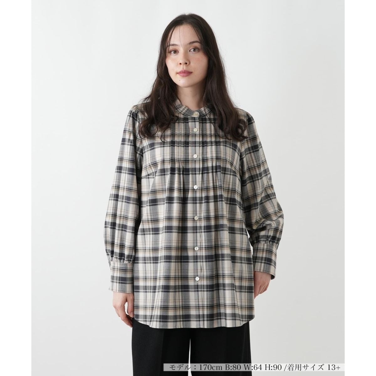 秋らしいチェック柄が目を引く、スタンドカラーブラウス。ポリエステルとレーヨンをベースに、毛とポリウレタンをブレンドした素材は、暖かみがありながらも、しなやかな肌触りが特徴です。品の良いスタンドカラーと長袖のデザインが、洗練された大人の女性の品格を演出いたします。ご自宅で手洗いできるウォッシャブル仕様で、日常のお手入れも簡単。一枚で着ても華やかな存在感を放ち、ジャケットやカーディガンのインナーとしても上品に映えます。オフィスシーンはもちろん、普段使いにもふさわしい、着回し力の高い一枚です。