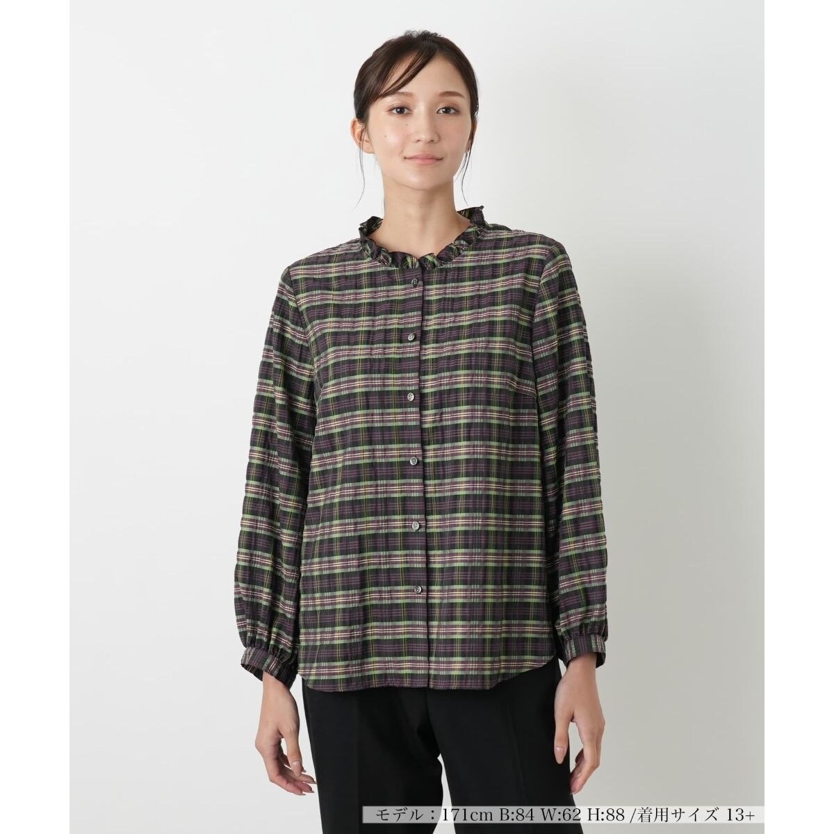 秋らしいチェック柄が目を引く、スタンドカラーブラウス。ポリエステルを主体とした素材にナイロン、レーヨン、キュプラをブレンドすることで、上品な光沢感と美しいドレープを実現いたしました。品の良いスタンドカラーと長袖のデザインが、洗練された大人の女性の品格を演出いたします。ご自宅で手洗いできるウォッシャブル仕様で、日常のお手入れも簡単。同シリーズのスカートとセットアップとしてもお召しいただけ、オフィスシーンはもちろん、普段使いにもふさわしい、着回し力の高い一枚です。