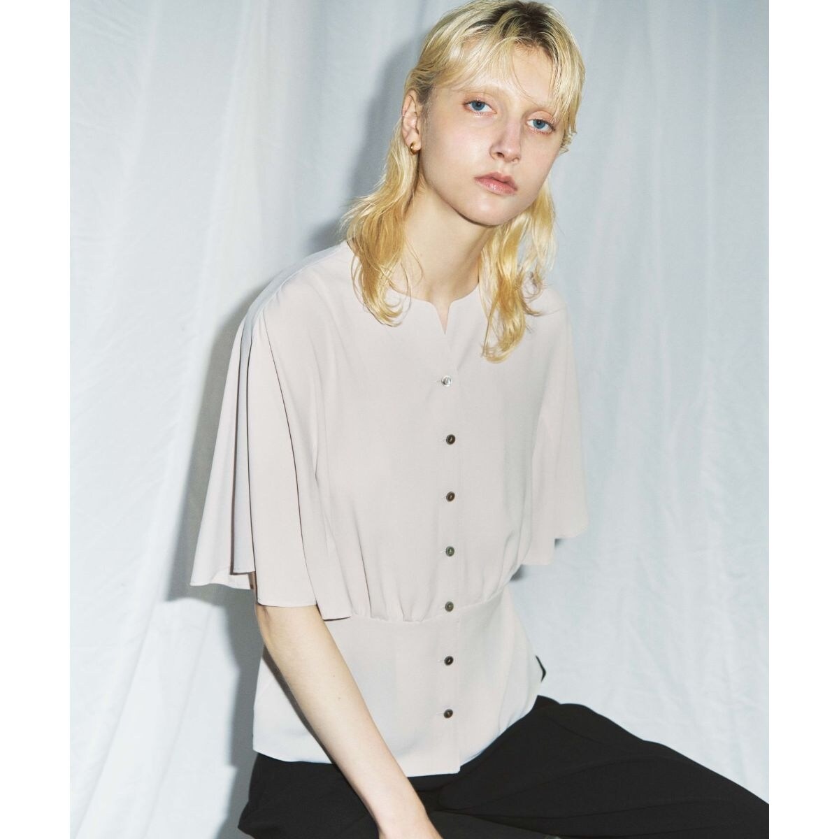 メリハリのあるフェミニンなシルエットが完成する、ミニマルなブラウス。高い位置でウエストを切り替えたペプラムが、気になるお腹周りをカバーし、スタイルアップを叶えます。優雅に揺れるフレアスリーブが、二の腕をほっそりと見せて上品な印象をプラス。伸縮性のある柔らかな生地で着心地も快適です。パンツにもスカートにも合わせやすく、オンオフ問わず着こなしの主役になる一枚です。