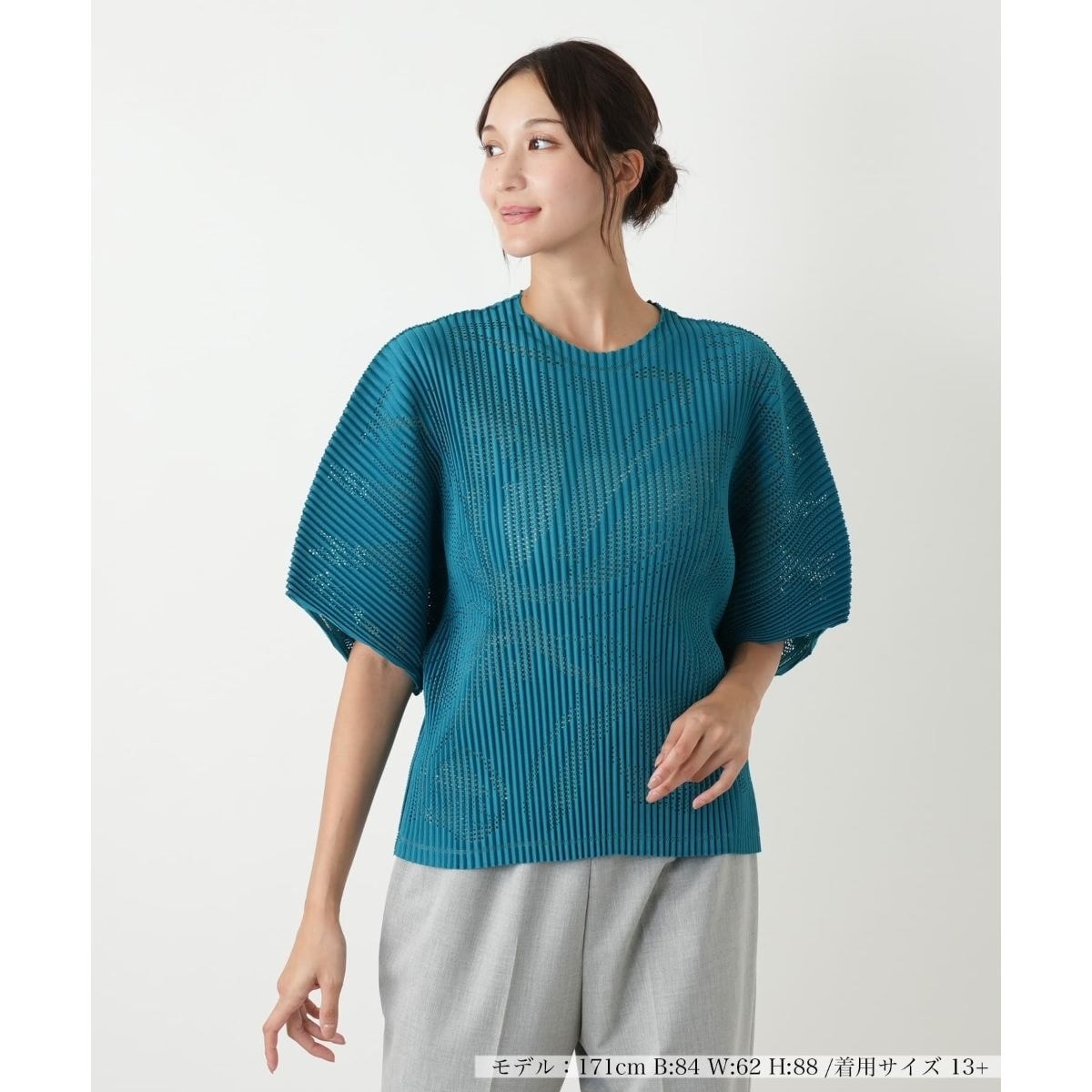 凹凸のある生地感と部分的に配されたアイレット(透かし編み)ディテールが独特な表情を生み出すブラウス。薄手で軽やかな生地は全体的に透け感があり、残暑が続く季節にも心地よい涼やかさを叶えます。伸縮性があるため、身体に優しくフィットし、ストレスフリーな着心地を実現。ドロップショルダーとゆったりとした五分袖が、リラックス感のある着こなしを叶えつつ、気になる二の腕をカバーします。きれいめなパンツやスカートと合わせれば、オフィスシーンやちょっとしたお出かけにも対応する、着回し力の高いアイテムです。