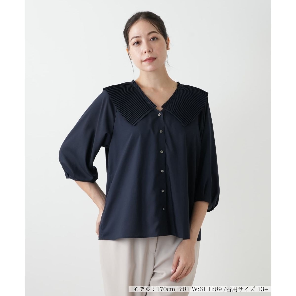 衿にあしらわれたプリーツデザインが、顔周りを華やかに彩るブラウスです。上品な無地仕立てで、大人の女性にふさわしい洗練された印象を与えます。半袖ですので、軽やかな着心地で、季節の変わり目から秋の早い時期まで快適に着用いただけます。一枚で着るのはもちろん、ジャケットやカーディガンのインナーとしても活躍し、様々なコーディネートに品の良さを添える一枚です。オフィスシーンはもちろん、ライトオケージョンにも対応するきちんとした雰囲気も持ち合わせています。ご自宅で手洗いができるウォッシャブル仕様のため、日々のお手入れも簡単で、清潔感を保ちながら長くご愛用いただけます。