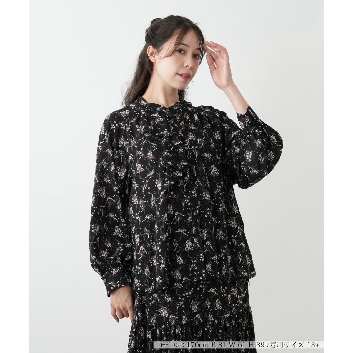 胸元を飾るラッフルフリルのボウタイがクラシカルなムードを演出するブラウス。繊細なタッチで描かれた小花柄と軽やかな素材感が、ヴィンテージライクな上品さを引き立てます。フロントはすっきりとした比翼仕立てで、フリルの存在感が際立つデザインに。ジャケットのインナーとしても活躍し、同素材のスカートと合わせれば、ワンピース風のセットアップスタイルもお楽しみいただけます。