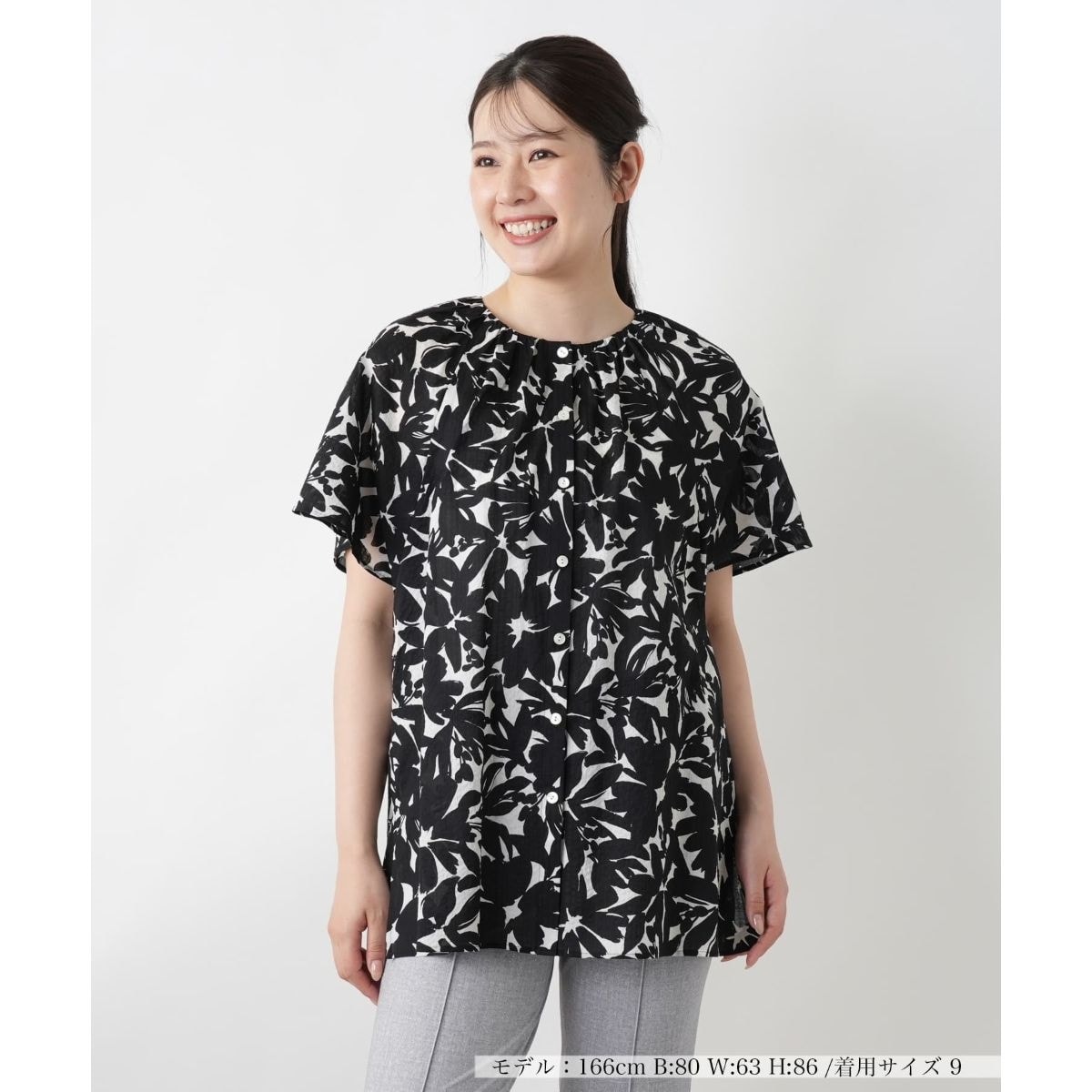 軽やかな生地感に、モノトーンで描かれたフラワー柄のプリントを落とし込んだブラウス。ギャザーを寄せたネックラインが程よいボリューム感を生み、シンプルながらも表情豊かなデザインに。ゆったりと広がるスリーブラインが、二の腕まわりをふんわりカバーします。生地には適度な伸縮性があり着心地も快適。ボトムインしなくてもバランスよく決まる丈感で、これからの季節のデイリーコーデに取り入れやすい一枚です。
