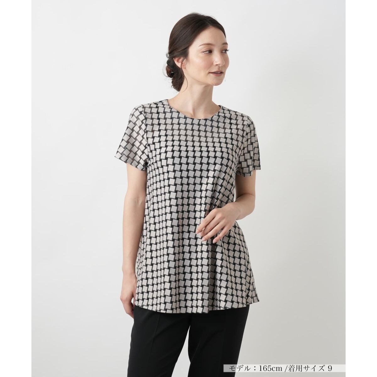 ランダムに並ぶスクエアパターンが印象的な幾何学柄のブラウス。透け感のあるナイロン混素材を使用し、ふわりと風をはらむような軽やかな着心地に仕上げました。裾に向かってやや広がるシルエットが身体のラインを拾わず、自然とフェミニンな印象に。一枚で映えるデザインだから、パンツにもスカートにも好相性。モード感と抜け感を両立させた、これからの季節のワードローブに嬉しい一枚です。バックネックの涙あきはボタン開閉が可能。