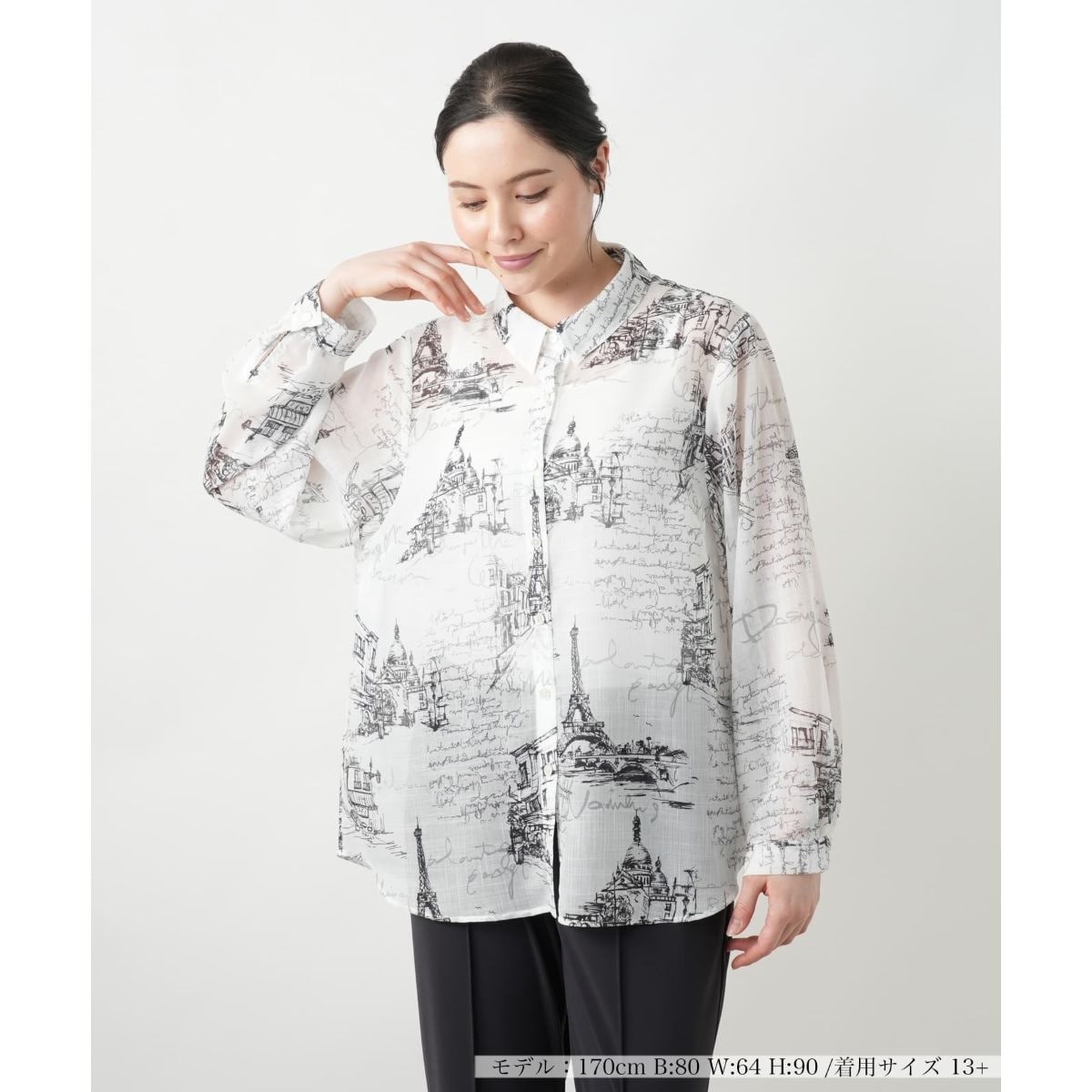 繊細なタッチで描かれた風景や文字がスケッチブックの1ページのように心をくすぐる、モノトーンプリントのエアリーなフレアブラウス。きちんと感のある襟元と、ふんわりと広がるシルエットの対比がエレガントな抜け感を演出します。さらりと軽やかな生地感で初夏の風を感じながら楽しめる洗練された日常着です。パンツですっきりとまとめるのはもちろん、フェミニンなスカートとも相性がよく、多彩なコーディネートで楽しめます。