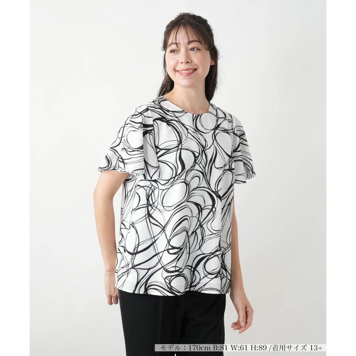 遠目からでも視線を惹きつける、動きのあるユニークな柄をプリントしたブラウス。シンプルなボトムスに合わせるだけでスタイリッシュな印象に仕上がります。程よく肩を覆う半袖丈とすっきりとしたシルエットのバランスがよく、デイリーからオフィスカジュアルまで幅広く活躍してくれそうなアイテムです。背中のファスナー開閉仕様で着脱もスムーズに行え、大人の装いにモダンなエッセンスを加えるトップスです。