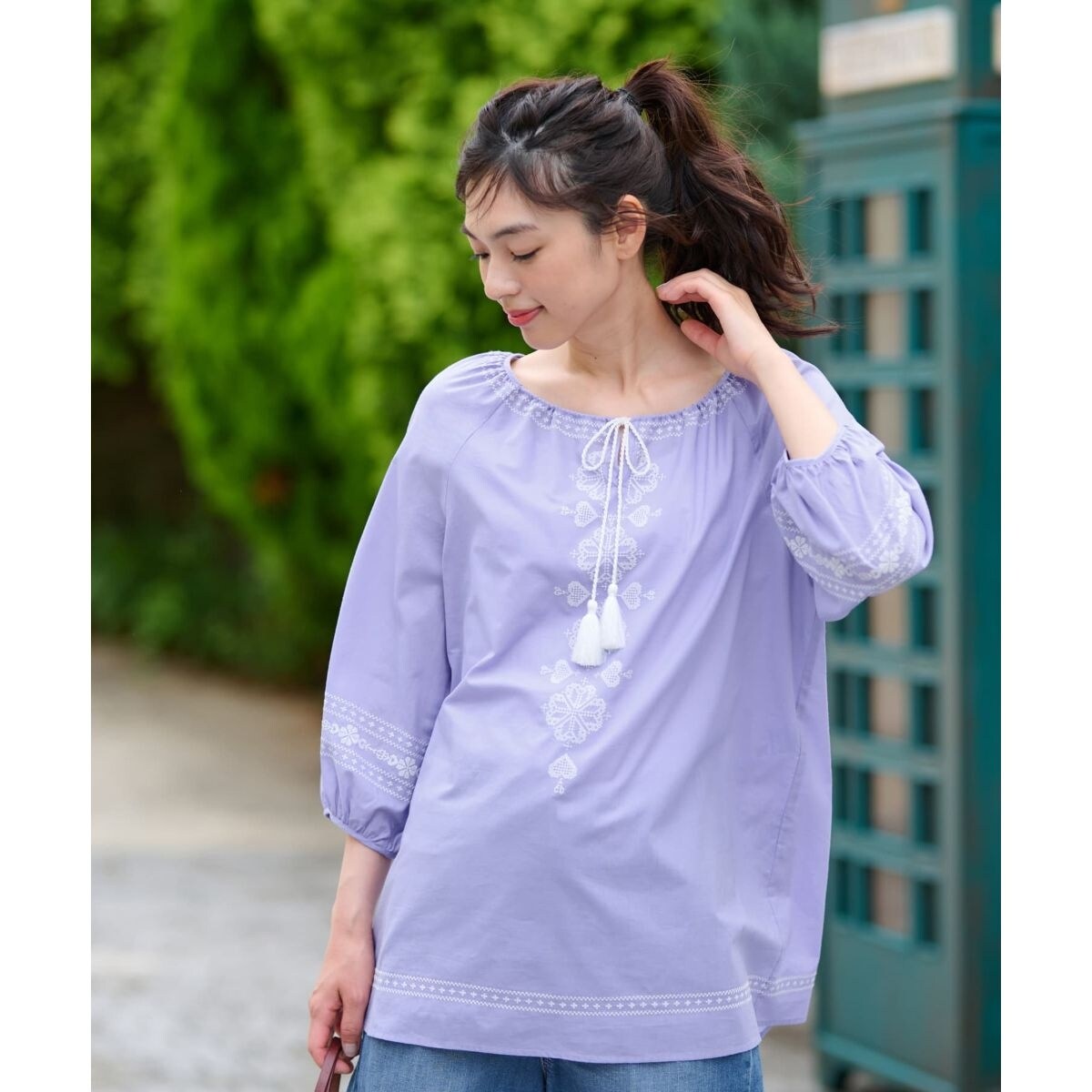 軽やかなコットン生地に、幾何学モチーフの刺繍を丁寧にあしらったブラウス。袖にふんわりとボリュームを持たせたバルーンスリーブが、動きに合わせて優雅に揺れます。ネックラインに添えたタッセル付きコードが、ナチュラルなアクセントに。一枚で着映えするデザインながら、デニムやワイドパンツとも好相性。ゆるやかなシルエットが肩の力を抜いた大人の余裕を感じさせるリラクシーなトップスです。
