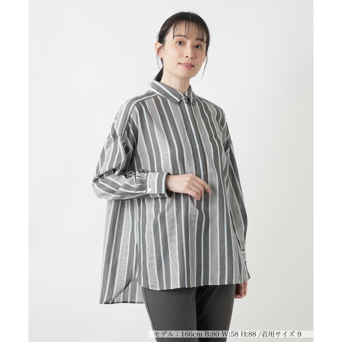 リズミカルなストライプが目を惹く、比翼ハーフプラケット仕様のブラウス。さらりとした風合いのコットン生地を使用し、軽やかな着心地を叶えました。ドロップショルダーで肩ラインを優しく落とし、程よいリラックス感のあるシルエットに。バックスタイルには開閉可能なボタンをあしらい、さりげない遊び心をプラス。裾にはサイドスリットを入れ、抜け感を作り出しています。こなれた大人のカジュアルスタイルが手軽に完成するアイテムです。