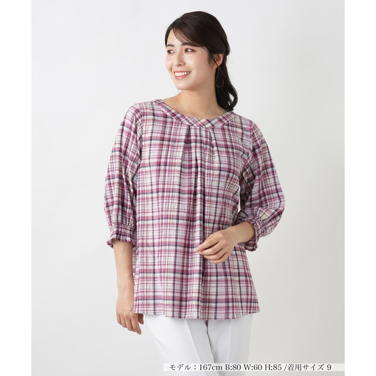 柔らかな色合いで構成された繊細なチェックが、春夏らしい爽やかさを演出するブラウス。フロントにはタックを入れて立体感を持たせ、シンプルな中に品のある表情を添えています。袖口はゴム仕様でフィット感をもたせ、自然な膨らみのあるシルエットに。クロップドスリーブですが、袖を少したくし上げてもきれいに決まります。バックには涙開きのディテールをあしらい、さりげない抜け感をプラス。パンツにもスカートにも合わせやすい丈感で、デイリーに活躍してくれる一枚です。