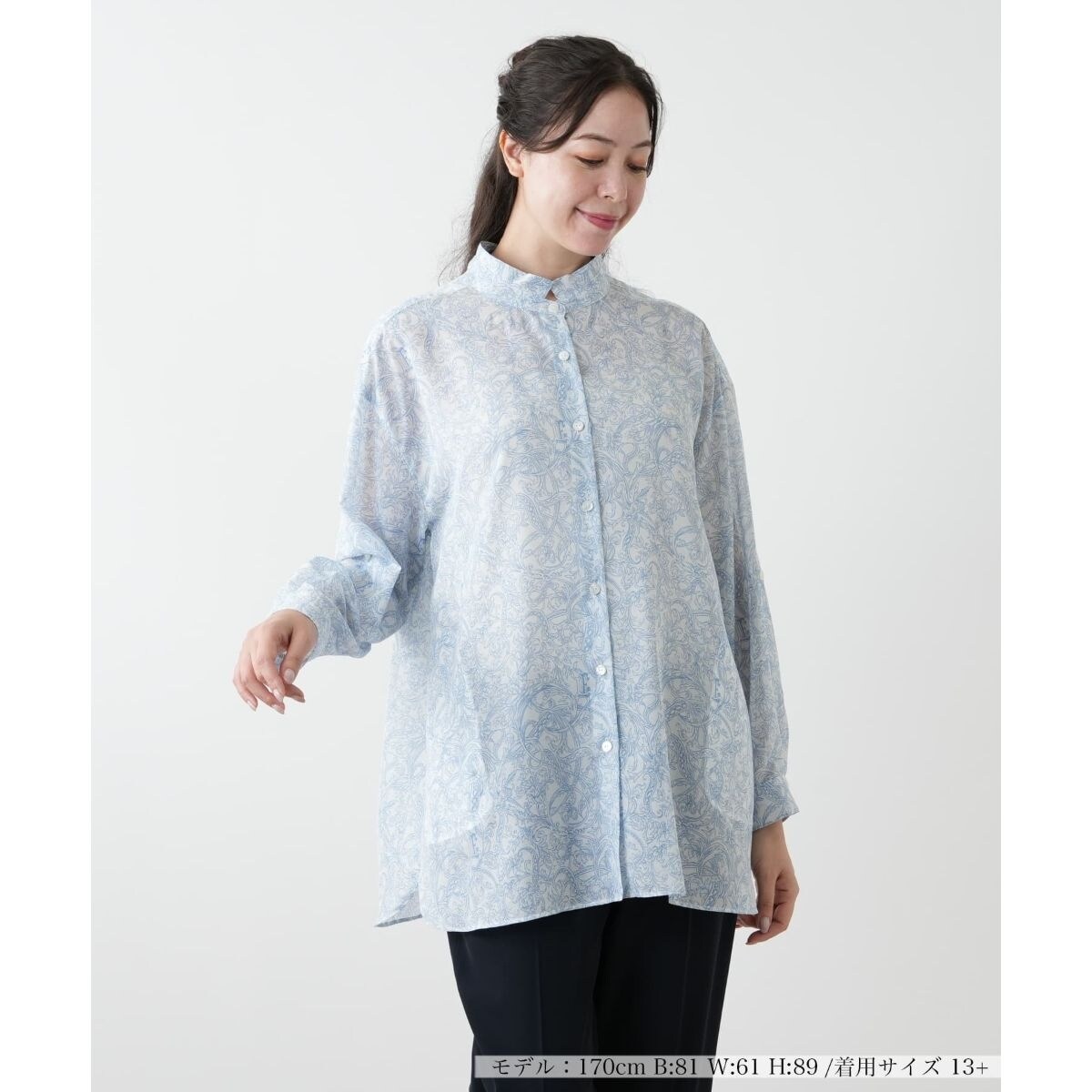 爽やかな色合いをベースに、エキゾチックなペイズリー柄をプリントしたスタンドカラーブラウス。華やかでありながら落ち着いた印象も兼ね備え、大人の洗練されたスタイルを演出。さらりとした薄手の生地を使用し、軽やかな着心地に仕上げました。ゆったりとしたシルエットがリラックスムードを漂わせ、こなれ感のある着こなしを叶えます。襟元はすっきりとした佇まいで、端正かつ上品なニュアンスをプラス。袖はボタンで留めてロールアップできる仕様となっています。