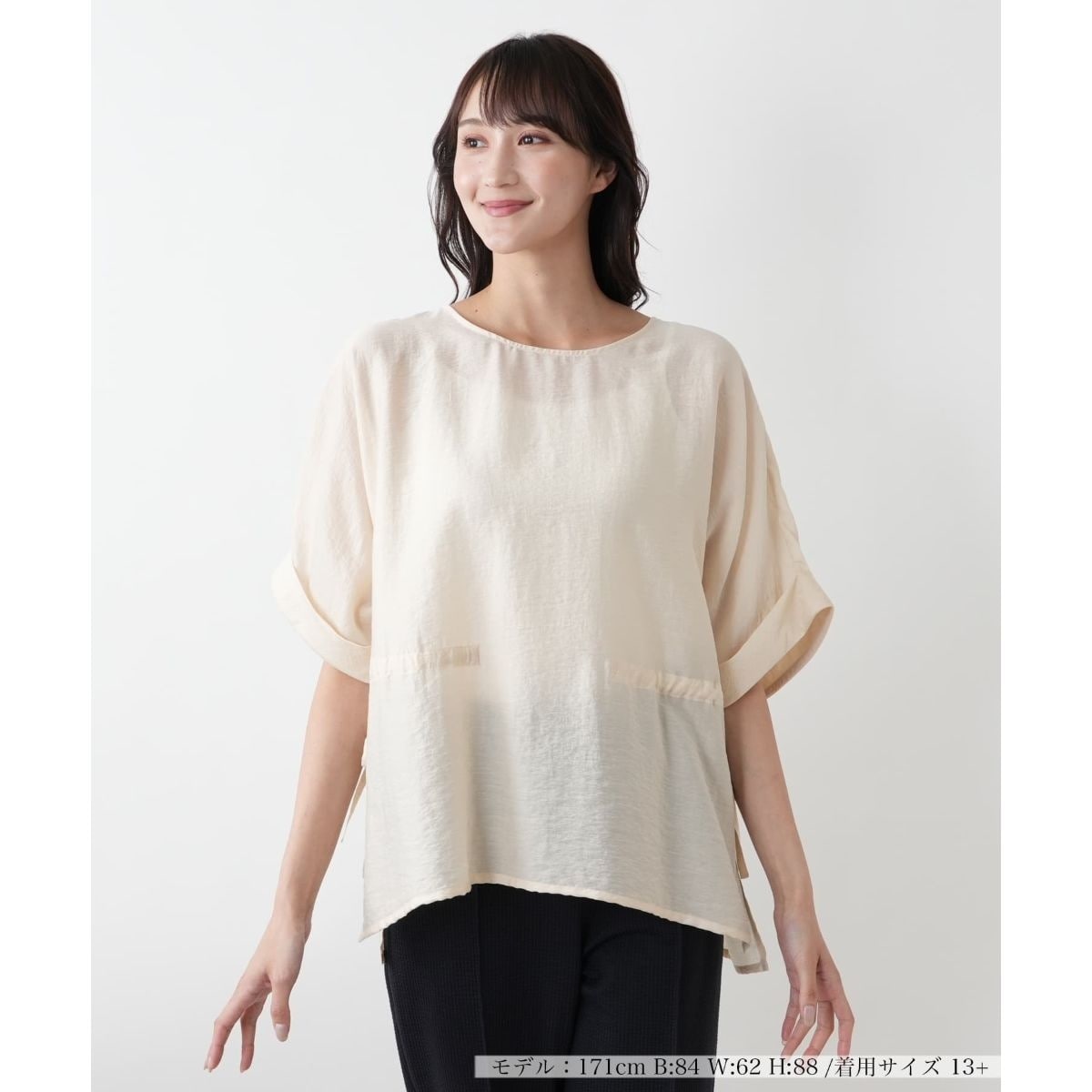 リラックスしたムードをまとわせるオーバーサイズブラウス。シワ感のある涼やかなファブリックを用い、軽やかな着心地と季節感を演出。ネックラインはすっきりと開き、折り返し仕立ての袖口や、裾に入れた深めのスリットがナチュラルな抜け感をプラス。ウエストにはドローストリングが施され、ギャザーの寄せ方でシルエットの調整が可能。バックネックの涙あきはさりげない後ろ姿のアクセントに。一枚でさらりと着映えし、日常にも休日スタイルにも寄り添うトップスです。