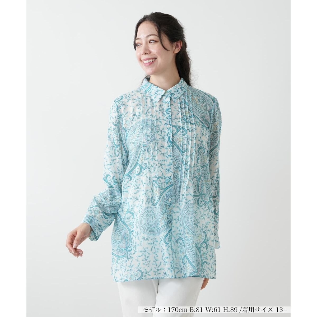 さらりとした風合いのコットン生地を使い、繊細なペイズリー柄をのせたブラウス。どこかオリエンタルなムードを漂わせ、日常にひとさじの華やぎを添えてくれる一枚。程よいゆとりをもたせたシルエットが、風をはらんで軽やかに揺れ、シーズンらしいエアリーな着こなしを叶えます。裾にはサイドスリットを入れ、絶妙な抜け感をプラス。フロントには細やかなピンタックを施し、甘さを抑えた上品なディテールで、大人のエレガンスをさりげなく引き立てます。