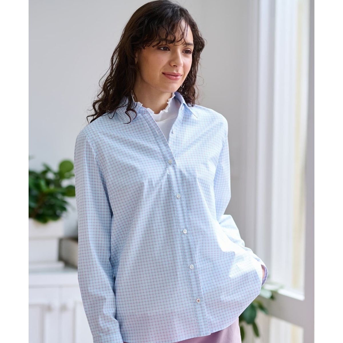フラワーモチーフを幾何学的にアレンジした、どこか懐かしさを感じさせるレトロなプリントが印象的なカジュアルシャツ。華やかさがありながらも品よくまとまり、大人のコーディネートにさりげないアクセントを添えてくれます。生地には爽やかな風合いの薄手コットンを使用しており、程よいストレッチ性もプラス。軽やかな着心地と動きやすさを兼ね備え、さっと羽織るだけでこなれたスタイルが完成するアイテムです。