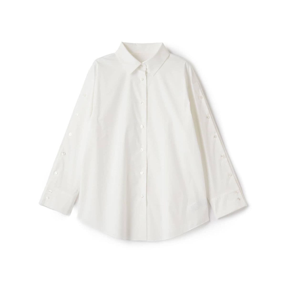 一見ベーシックなシャツブラウスは袖にボタンを取り付けることでケープのようにも着用できる遊び心をプラス。