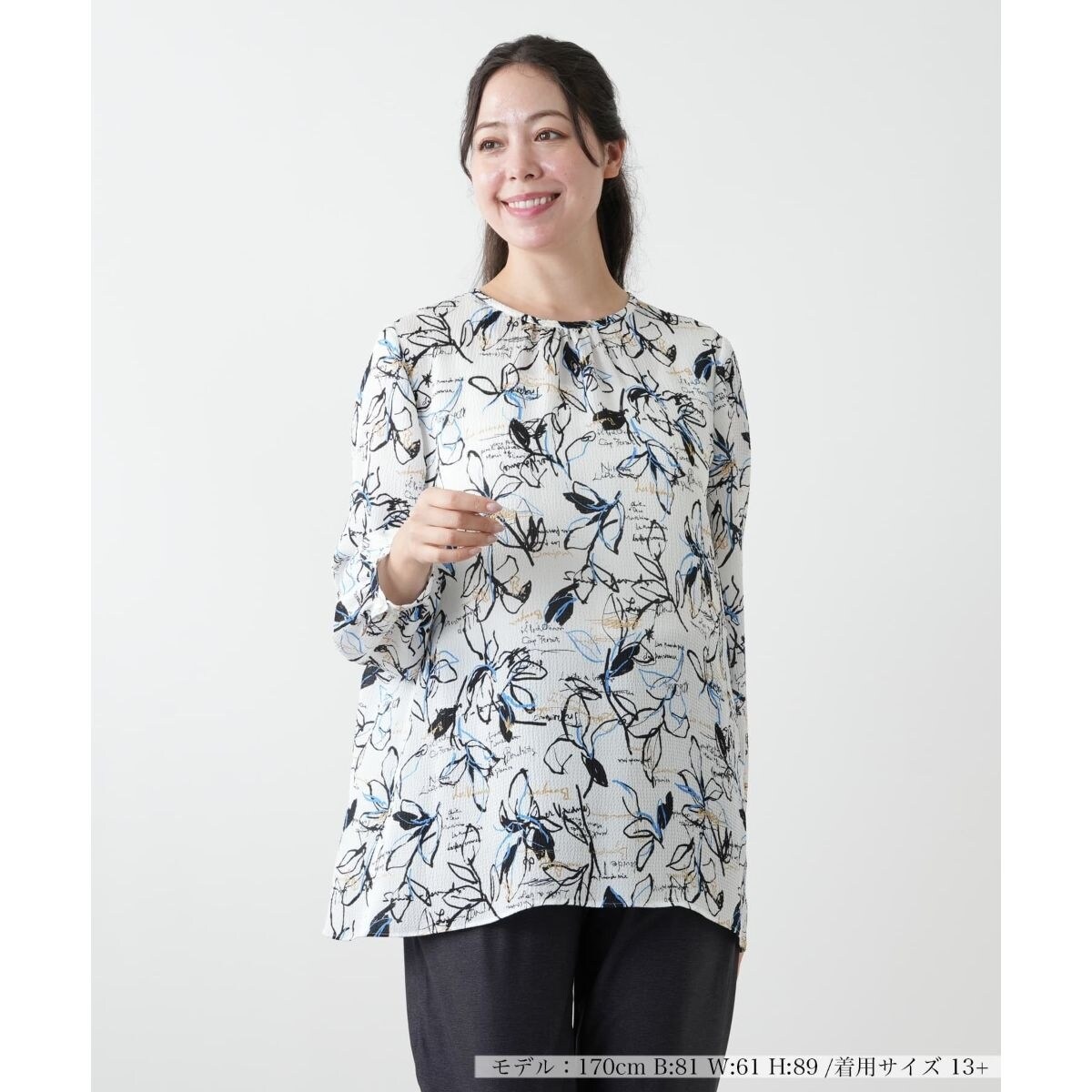 上品なボタニカル柄が魅力の長袖ブラウス。