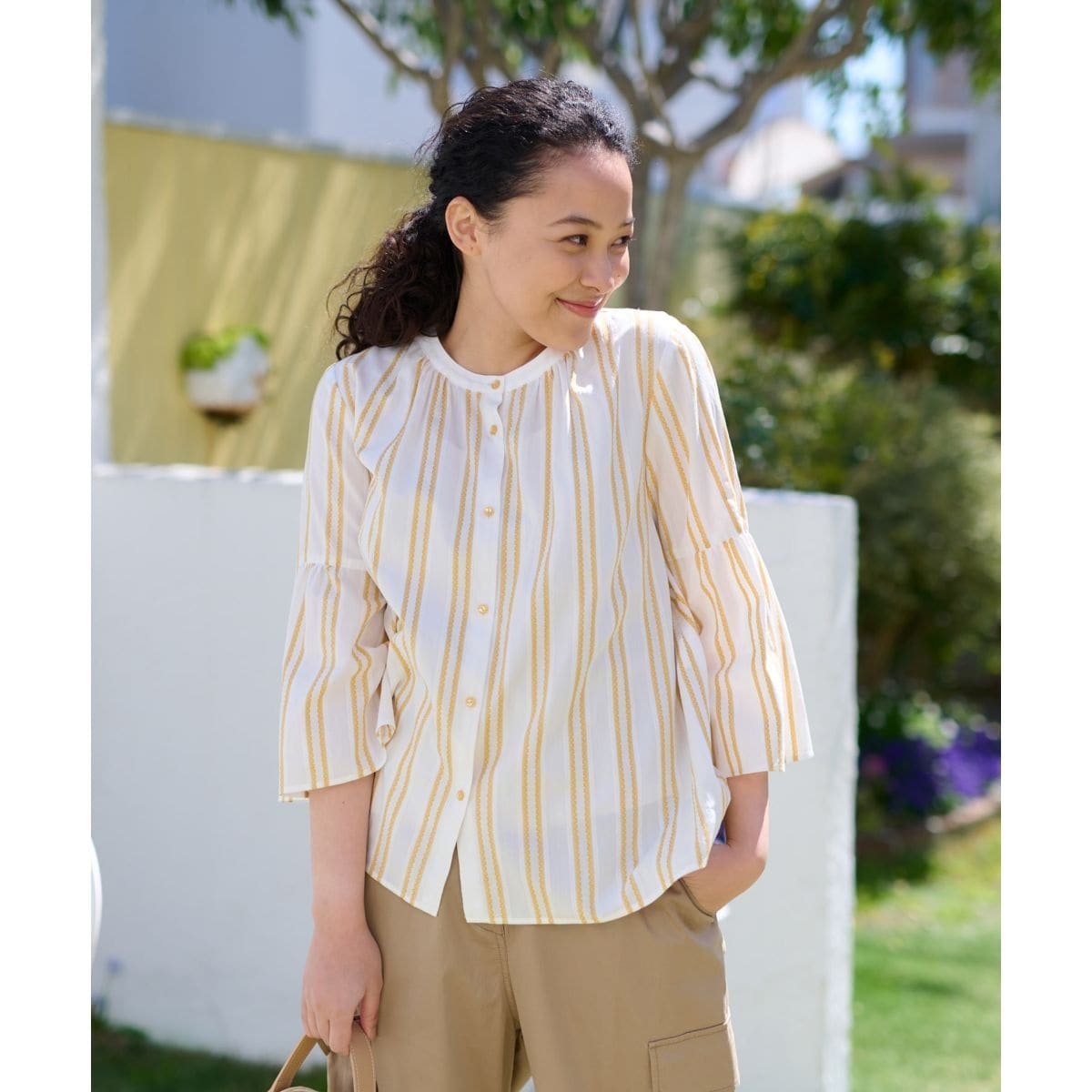 春夏らしいパッと目を惹く色合いが魅力のダブルストライプをのせたバンドカラーシャツ。肌当たりのよいナチュラルな風合いのコットン生地を使用。切り替えからフレアシルエットを描くスリーブラインがほのかに大人の可愛らしさを感じさせます。デニムやワイドパンツやミモレスカートとの相性もよく、シーズンスタイルにいっそうの軽やかさを演出してくれる一枚です。