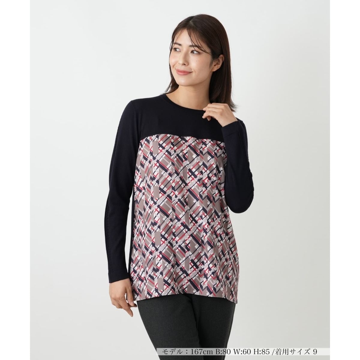 モダンで奥行きのあるオプティカルなチェック柄を大胆に配した、異素材ドッキングデザインのクルーネックニットプルオーバー。袖と後ろ身頃は肌触りの良いシンプルな無地のニットなのでジャケットを羽織ってももたつかず、シルエットは程よいリラックス感があり、快適な着心地を実感できます。ボトムスを選ばずに合わせやすく、手軽にお洒落な着こなしが決まる、忙しい日にも頼りになるトップスです。